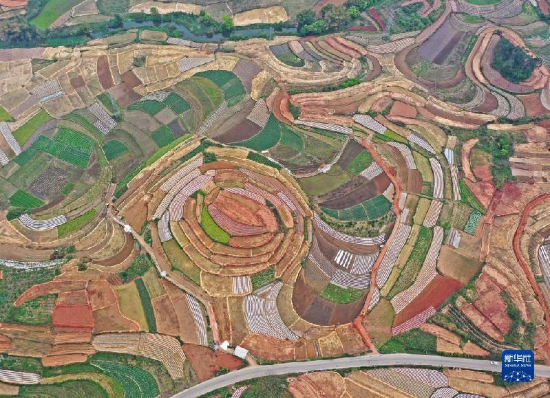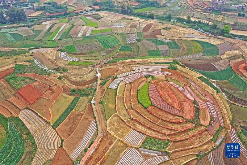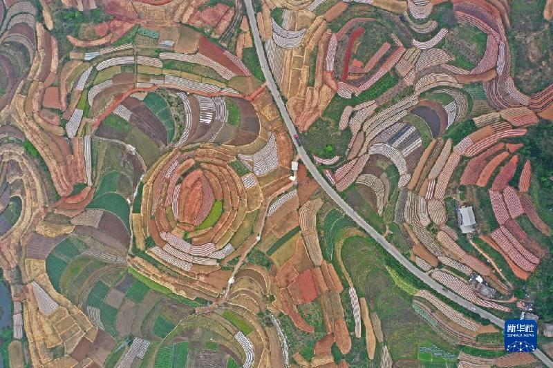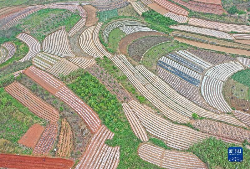 春回大地,广西南宁市邕宁区蒲庙镇纵横交错的田地色彩斑斓,宛如色彩丰富的调色板(3月13日摄,无人机照片)。