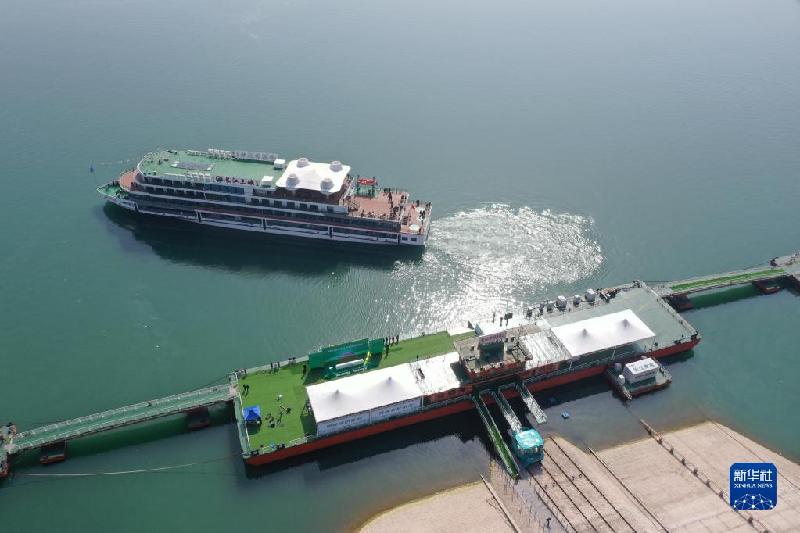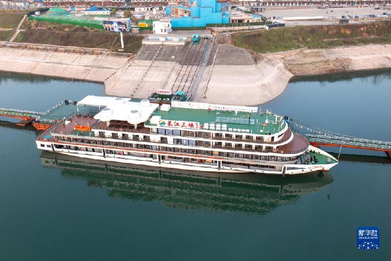 3月29日,“长江三峡1”号游轮停泊在湖北省宜昌市秭归县茅坪港码头等待首航(无人机照片)。