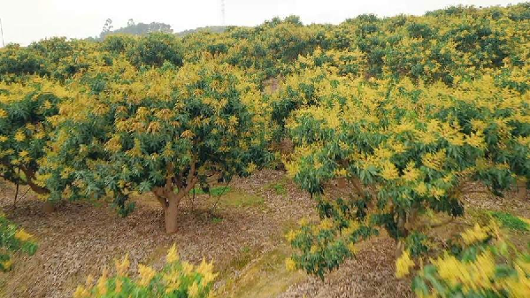 连日来,在广西百色右江区四塘镇六合村的全国“一村一品”芒果示范基地里,这里的17800多亩芒果树正开着淡黄色的小花。