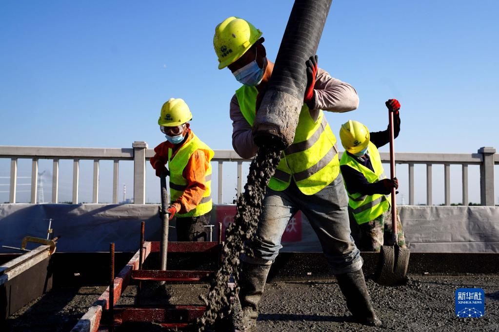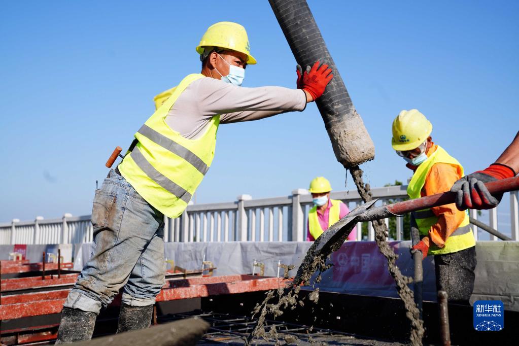 5月21日,在济郑高铁山东长清黄河特大桥施工现场,中铁上海局工作人员进行无砟轨道施工作业。