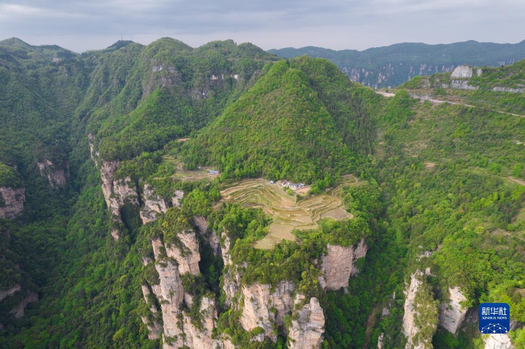 这是4月19日拍摄的武陵源风景名胜区老屋场空中田园景点(无人机照片)。