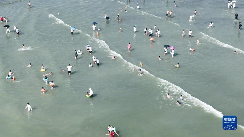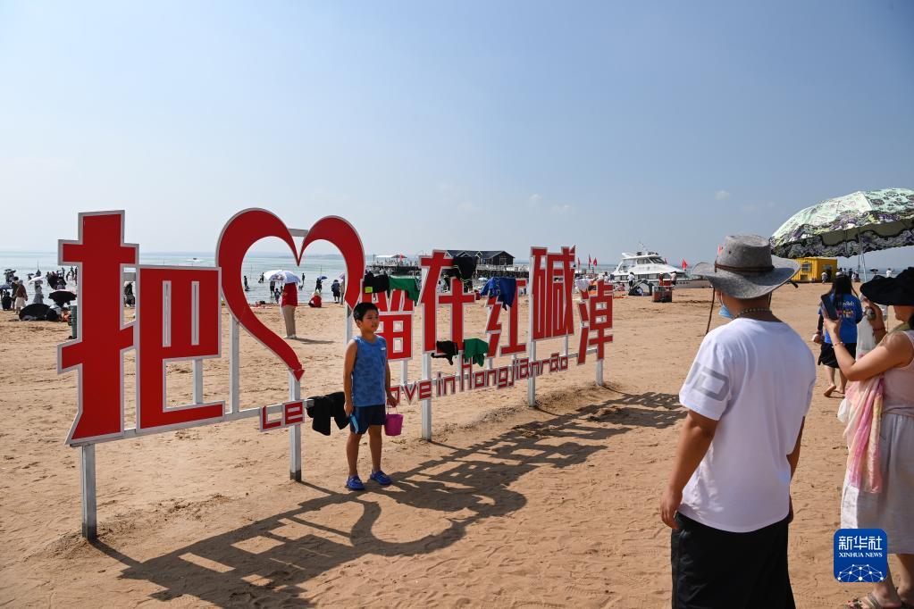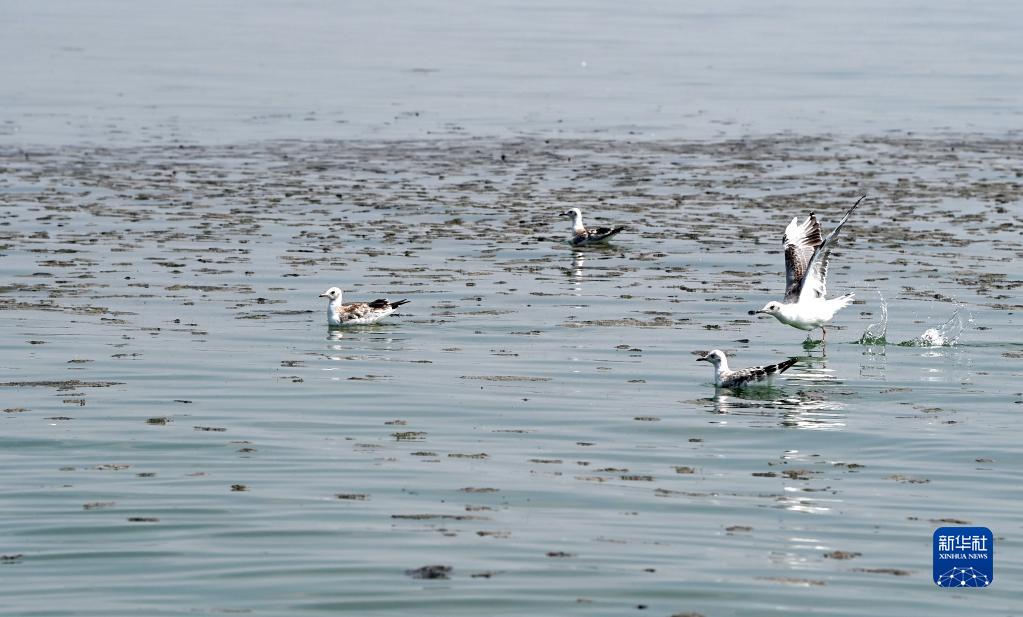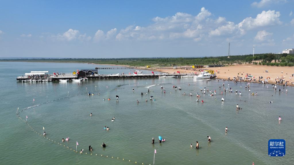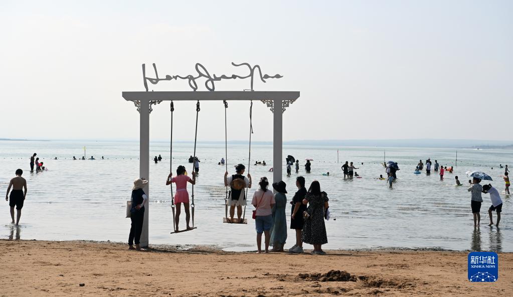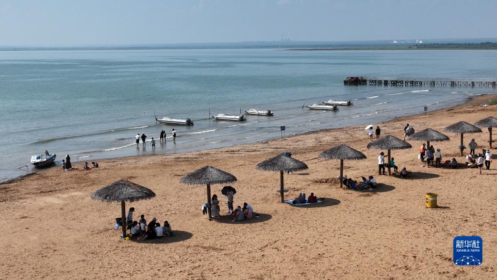 8月5日,游人在红碱淖景区休闲(无人机照片)。