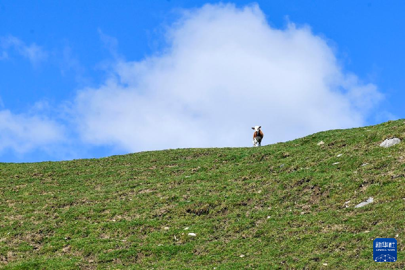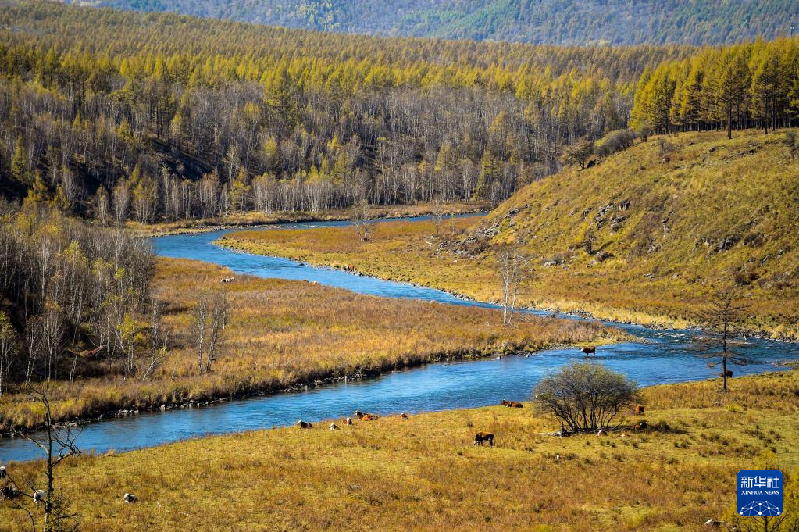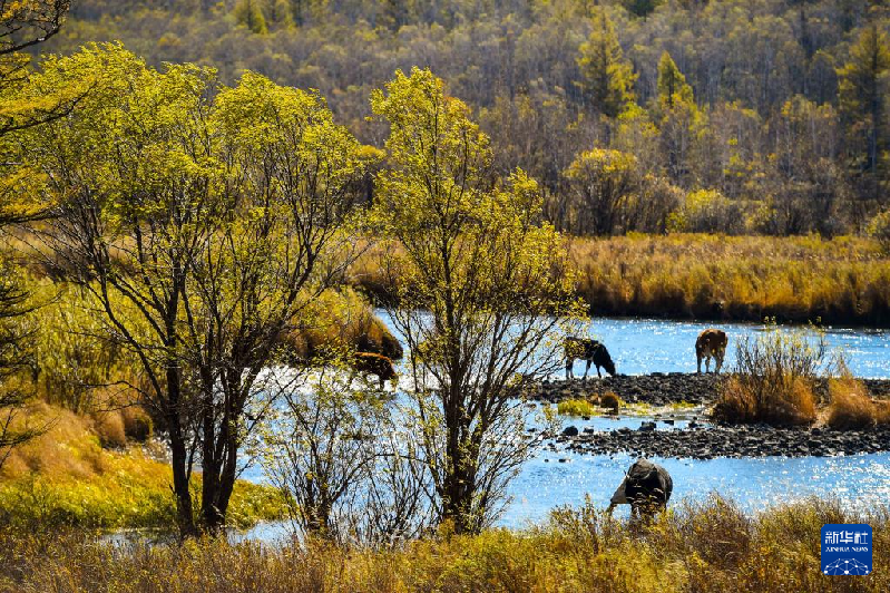 9月21日,牛群在阿尔山国家森林公园内的河岸边觅食。