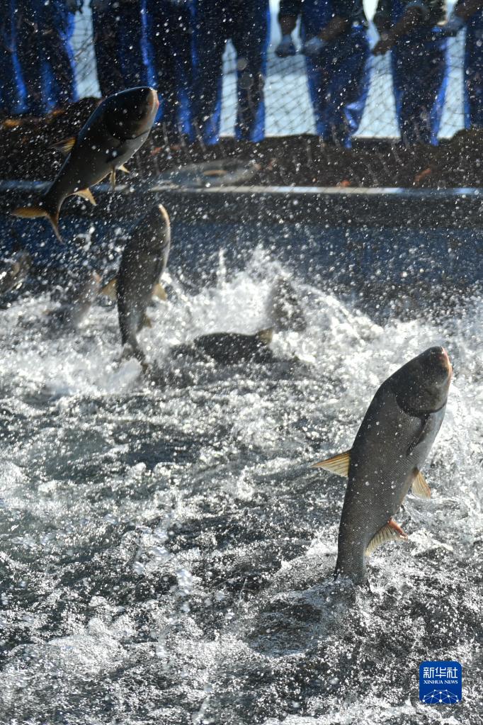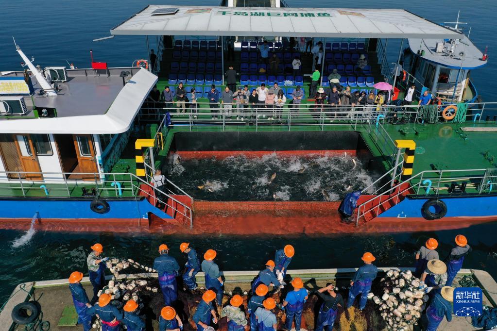 金秋时节,浙江省淳安县千岛湖黄山尖水域开展巨网捕鱼,捕捞队员合力拉网,捕获12万多斤鲢鳙鱼,沸腾鱼乡迎来丰收季。