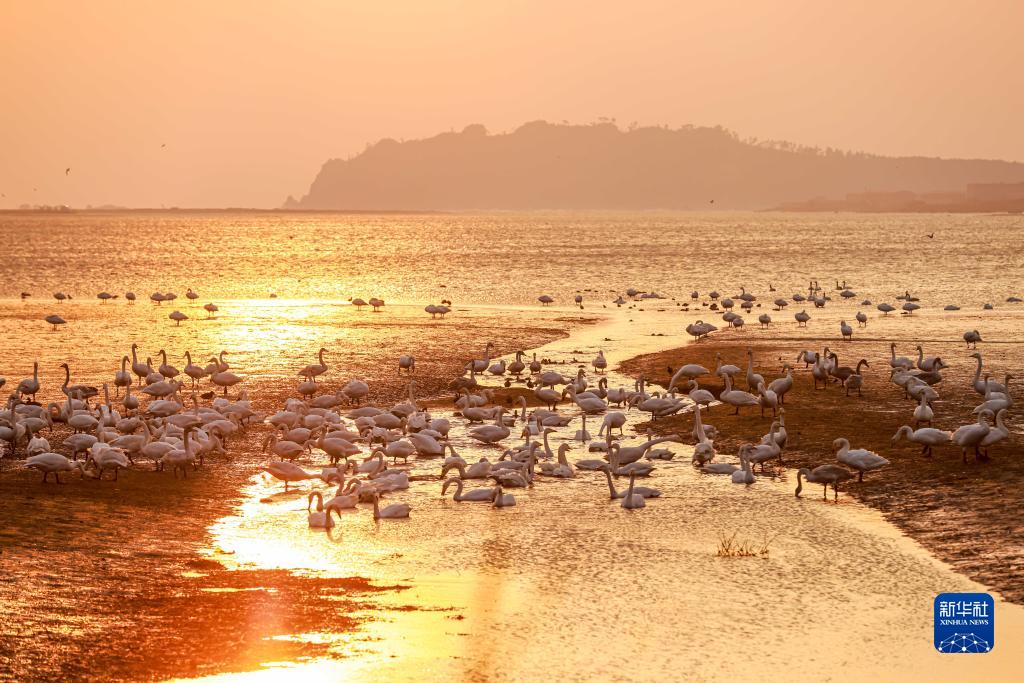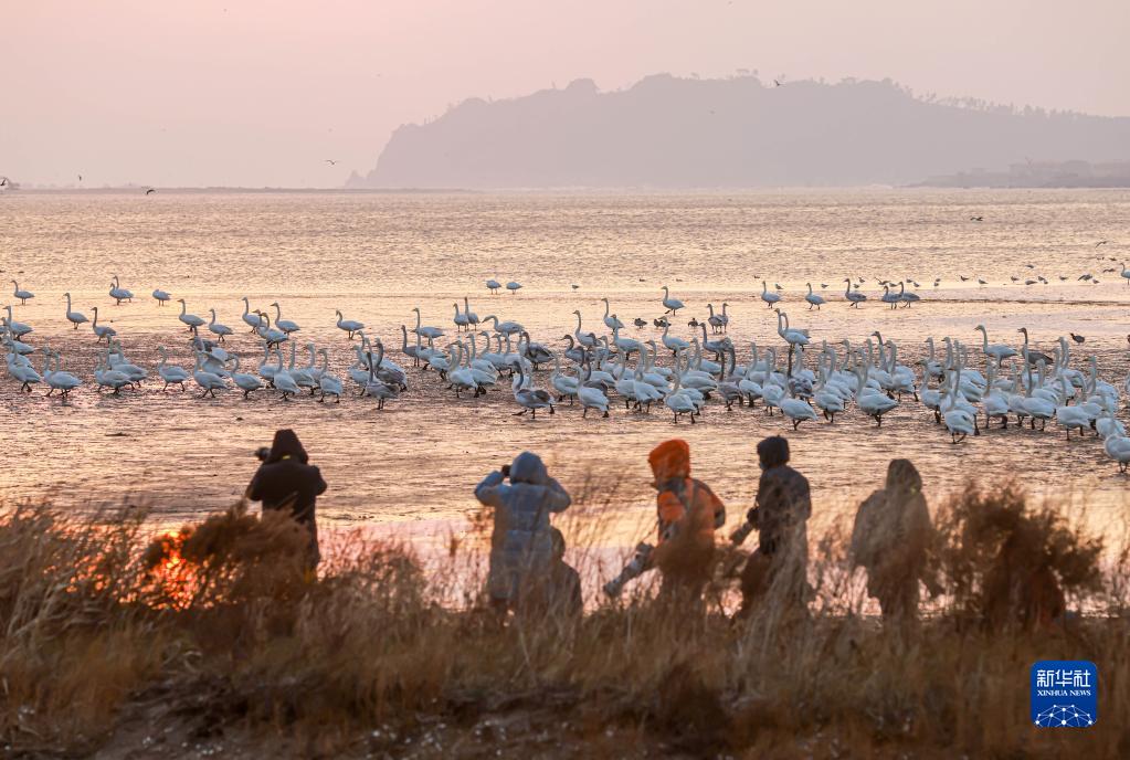 近日,大批大天鹅飞抵山东省荣成市成山镇天鹅湖湿地栖息越冬,场面蔚为壮观,吸引众多游客前来欣赏。