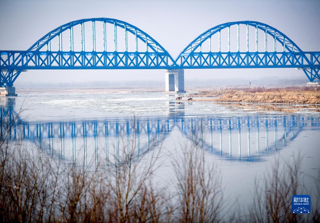 2023年1月2日,几头牛在位于宁夏银川市境内的黄河边喝水。