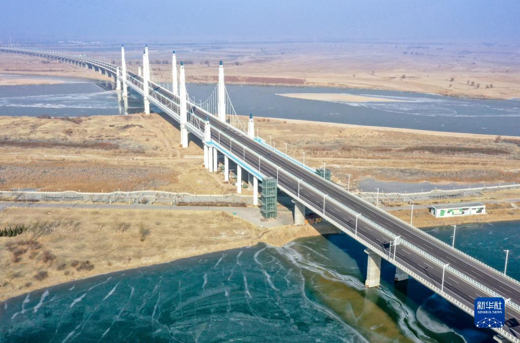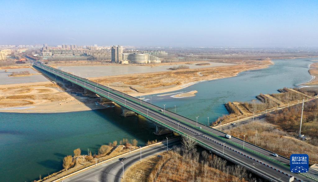 这是2023年1月2日拍摄的宁夏银川市滨河黄河大桥(无人机照片)。