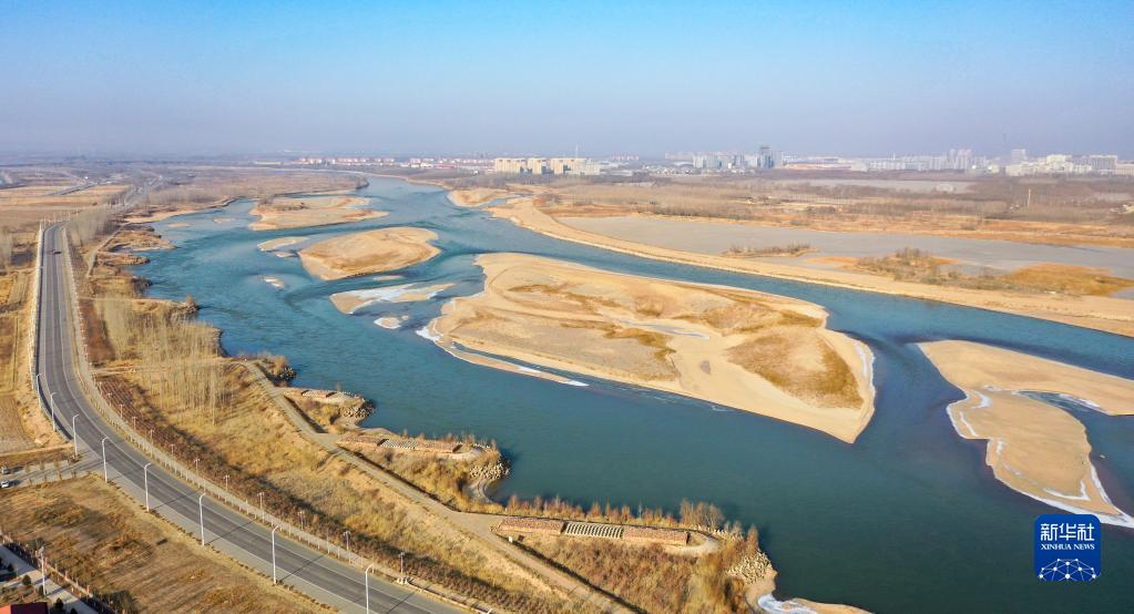 这是2023年1月2日拍摄的位于宁夏银川市境内的黄河景观(无人机照片)。