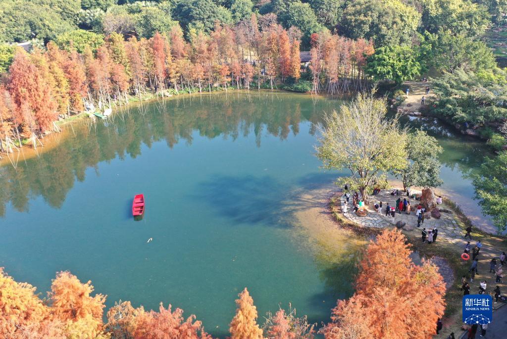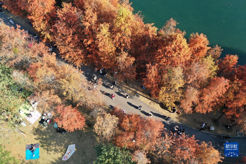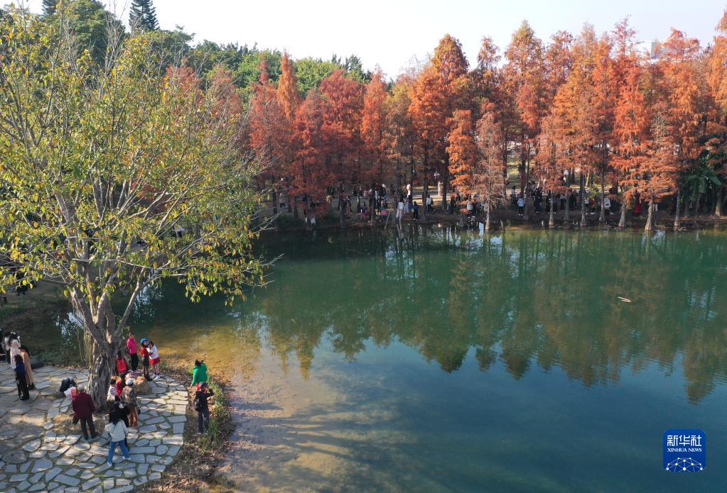 近日,广西南宁青秀山风景区中的杉树树叶日益红艳,吸引了众多市民前来观赏。