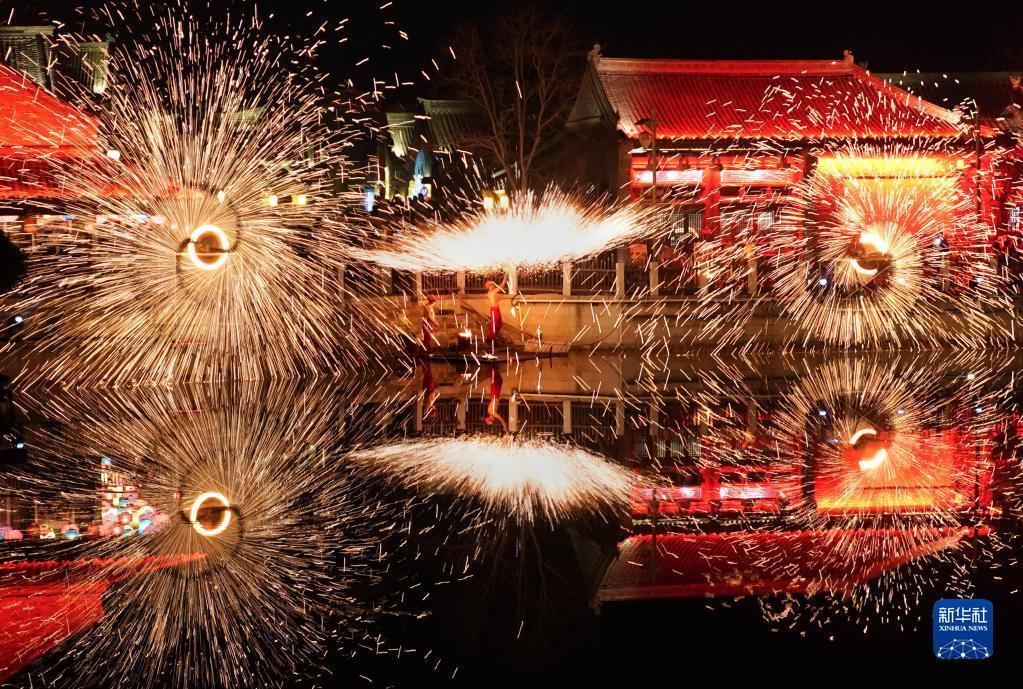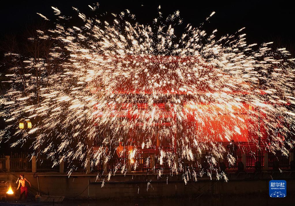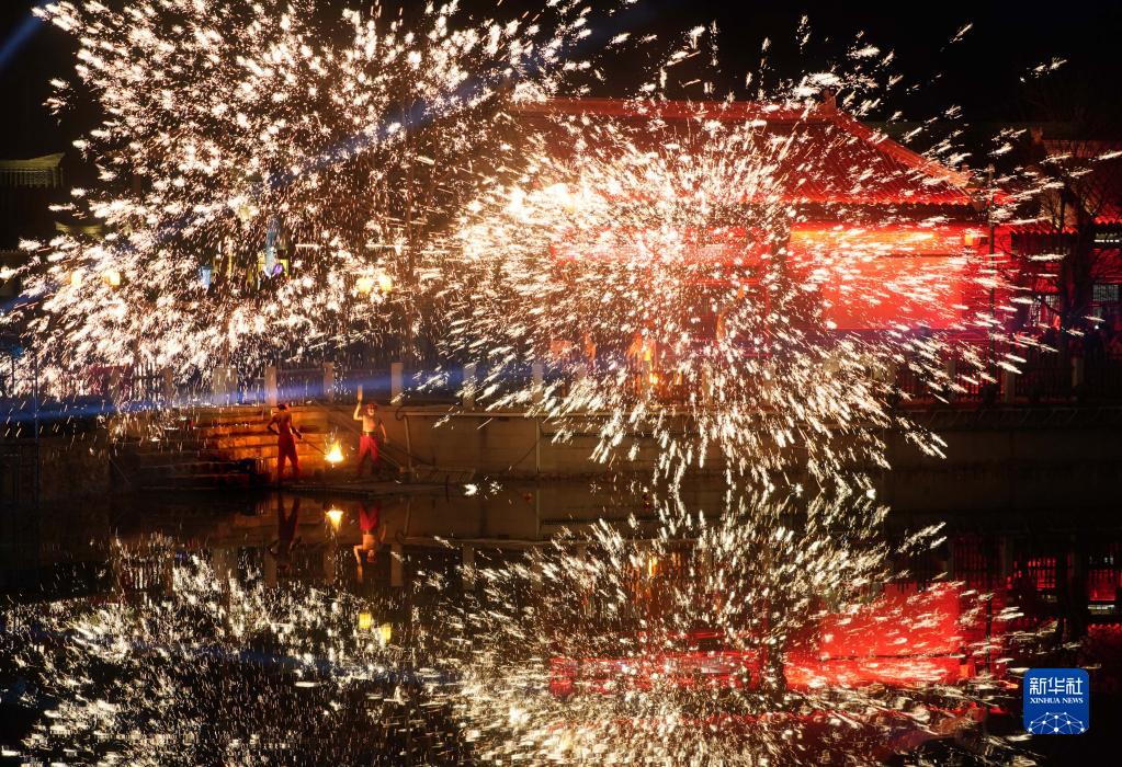 2022年12月31日,工作人员在位于郑州市中牟县的电影小镇里表演打铁花。