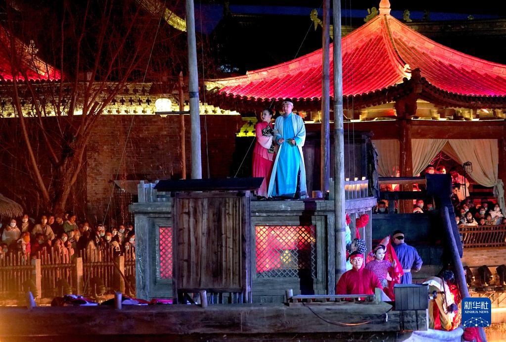 2023年1月2日,游客在开封市清明上河园里观看表演(无人机照片)。