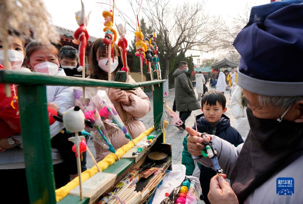 2023年1月2日,游客在开封市清明上河园里挑选民间艺人制作的面人。