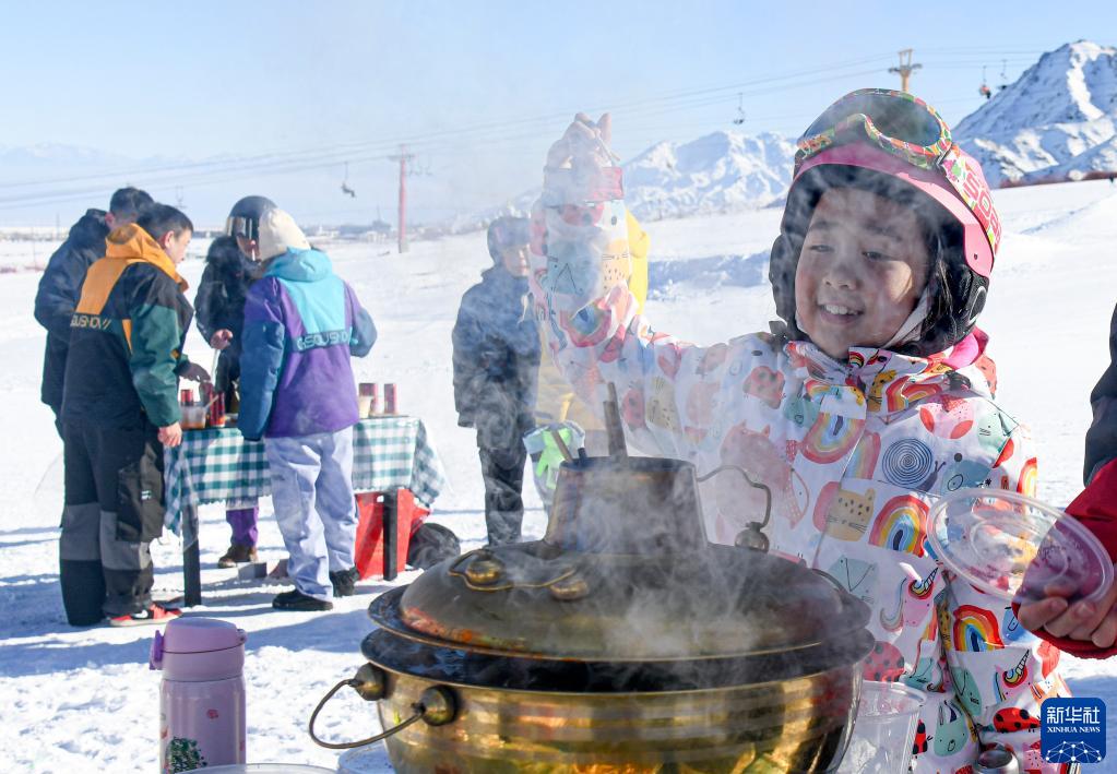 新疆白云国际滑雪场,小朋友在雪场举办的冰雪火锅节上等待品尝美食(2023年1月13日摄)。新华社记者 王菲 摄