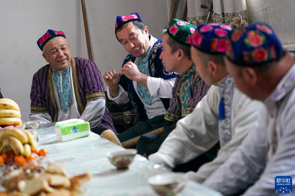 在新疆鄯善县鲁克沁镇木卡姆村,吐鲁番木卡姆传承人苏来曼·阿不都(左一)和乡村艺人聊天(2023年1月11日摄)。节庆或者聚会邀请木卡姆艺人一起演奏歌唱,是当地的传统保留节目。新华社记者赵戈 摄