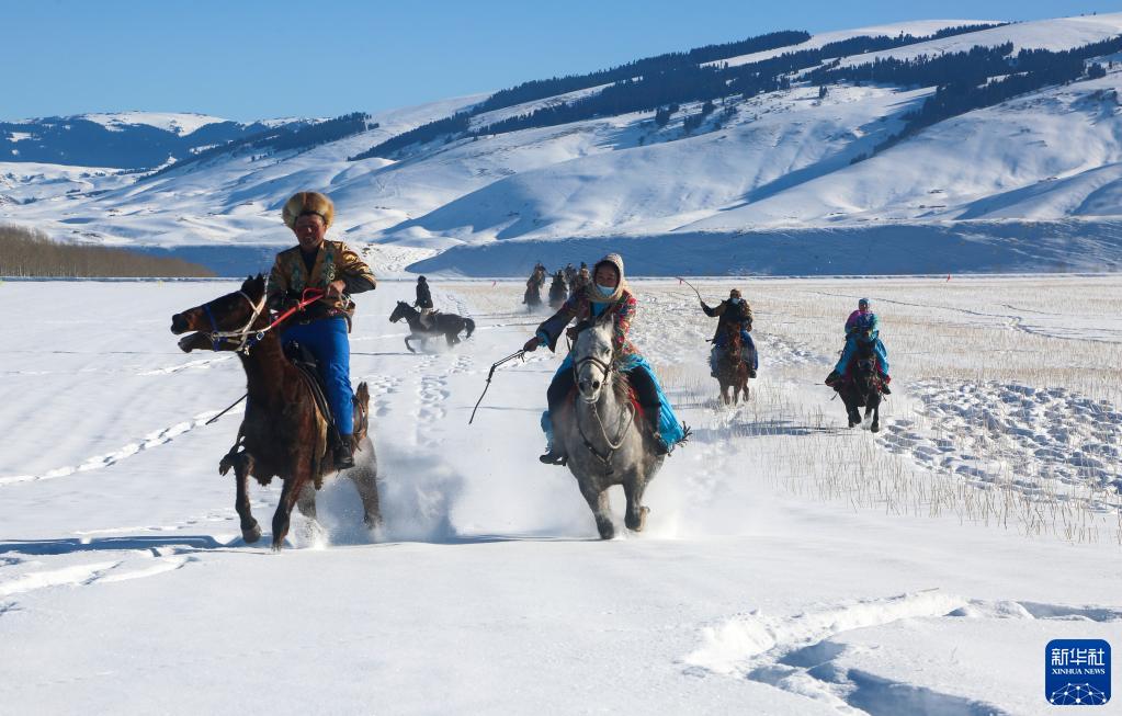 在新疆昭苏县萨尔阔布乡一处雪原上,当地农牧民进行“姑娘追”活动(2022年12月21日摄)。“姑娘追”是哈萨克族的传统马上体育运动。入冬以来,昭苏县各族农牧民开展丰富多彩的民间文化体育活动,丰富冬闲时节生活。新华社发(李文武摄)