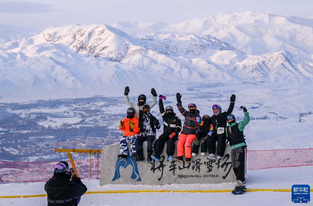 游客在新疆阿勒泰将军山滑雪场合影留念(2022年12月30日摄)。新华社记者 胡虎虎 摄