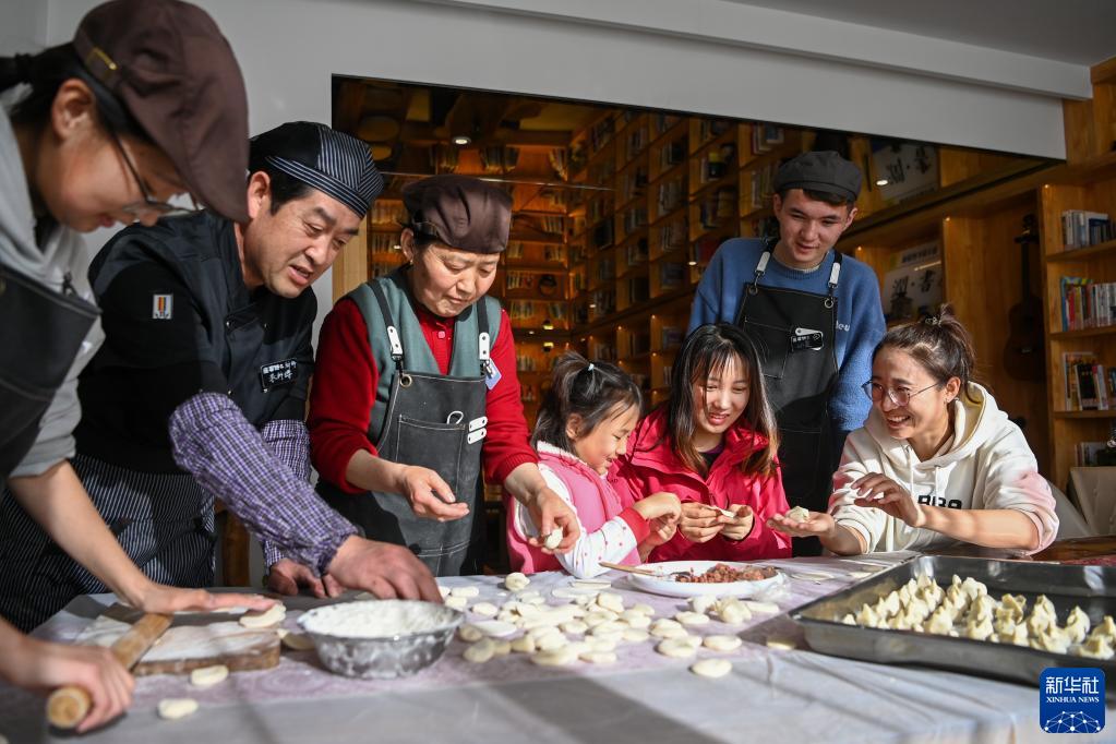 新疆乌鲁木齐县板房沟乡乐野民宿,来自广州的游客柳佳佳(右三)一家和民宿工作人员一起包饺子(2023年1月20日摄)。新华社记者丁磊 摄