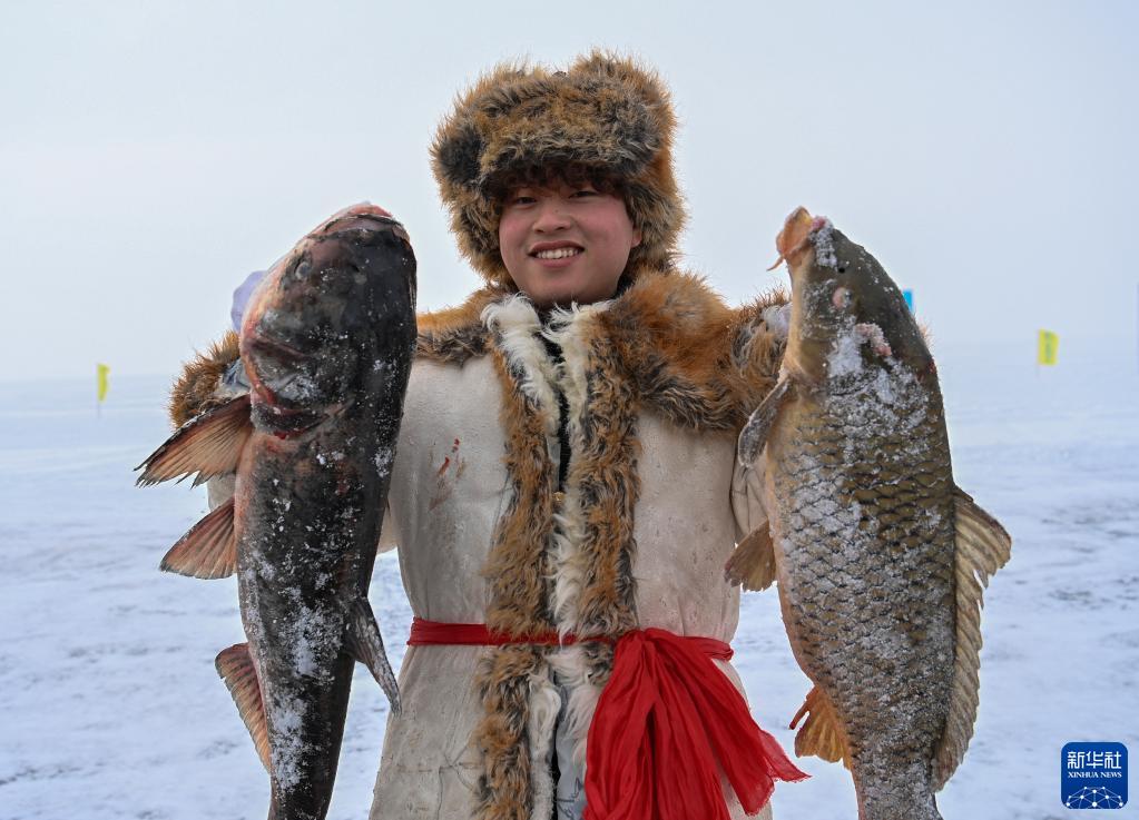 在新疆福海县第十六届乌伦古湖冬捕文化旅游节上,渔工展示劳动收获(2023年1月7日摄)。新华社记者 李响 摄