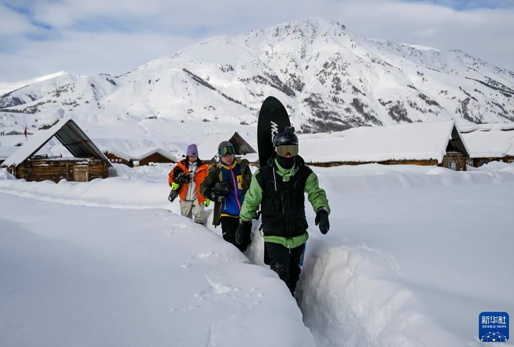 来自广东的雪友在新疆阿勒泰地区禾木村游玩(2023年1月14日摄)。新华社记者 胡虎虎 摄