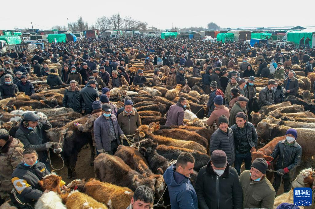 人们在新疆创锦黄公农产品交易市场交易(2023年2月1日摄,无人机照片)。当日,位于新疆伊宁县愉群翁回族乡阿勒推村的创锦黄公农产品交易市场开市,市场商品琳琅满目,牛羊马交易火爆。新华社发(刘春星摄)