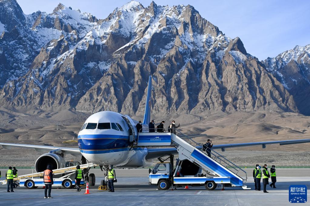 2022年12月23日,巍巍帕米尔高原上,中国最西端的运输机场——新疆塔什库尔干红其拉甫机场正式通航,冰山上迎来首批“空中来客”。新华社记者丁磊 摄