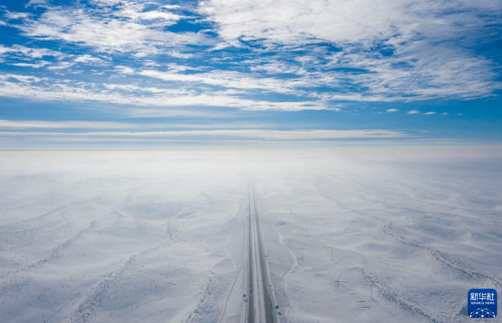 阿勒泰至乌鲁木齐的高速公路,穿越古尔班通古特沙漠(2023年1月16日摄,无人机照片)。