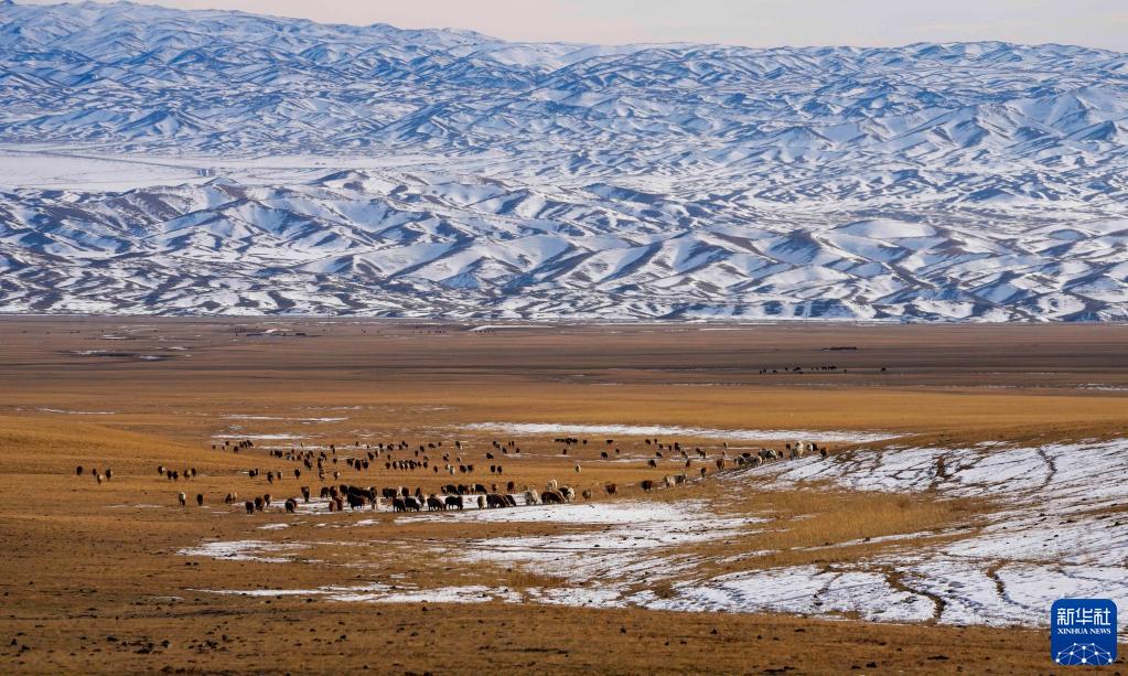 羊群在新疆裕民县巴尔鲁克山冬季牧场觅食(2022年11月4日摄)。新华社发(陈双喜 摄)