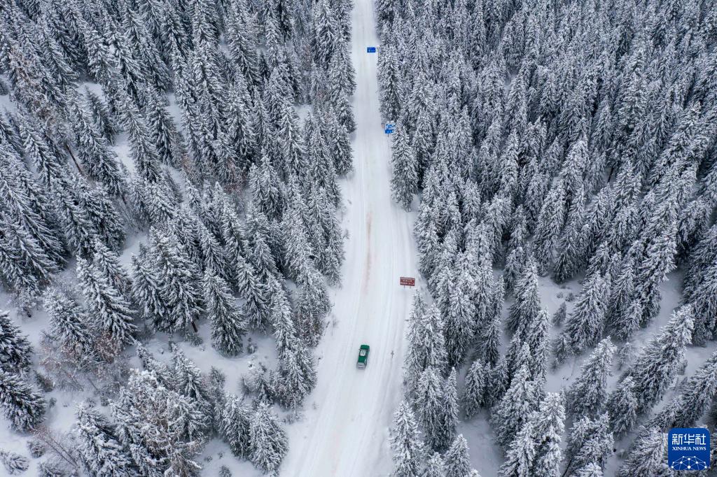 游客驾车在新疆喀纳斯景区行驶(2023年1月8日摄,无人机照片)。新华社记者 胡虎虎 摄