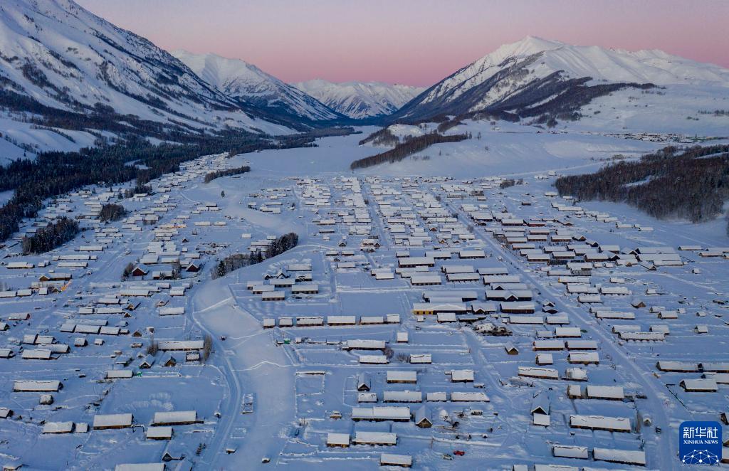 冬日新疆,冰雪点缀。皑皑白雪掩盖了大地的颜色,整个世界变得纯洁静谧。俯瞰树林,松涛荡漾,白霜尽染;远眺村落,粉妆玉砌,美如仙境。