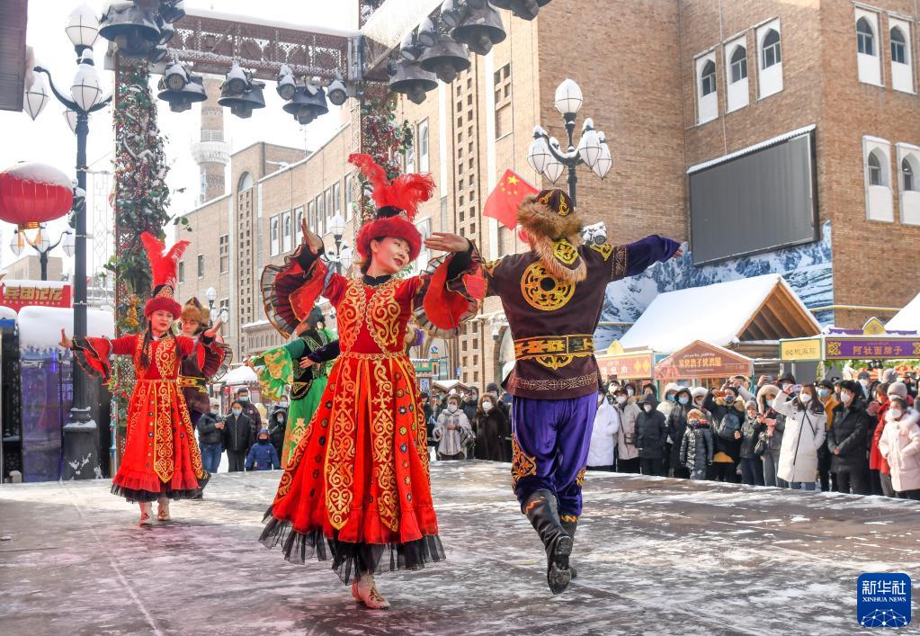 乌鲁木齐大巴扎景区,市民和游客观赏庆新春歌舞表演(2023年1月23日摄)。新华社记者 王菲 摄
