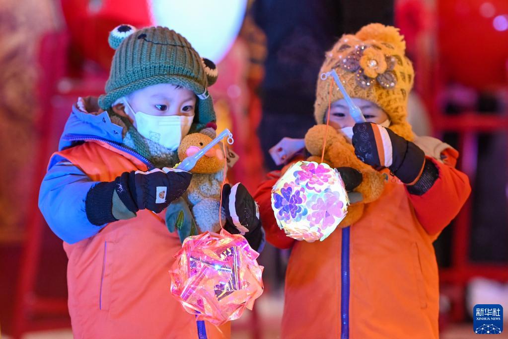 乌鲁木齐七一东街广场,小朋友提着花灯游玩(2023年1月22日摄)。新华社记者 丁磊 摄