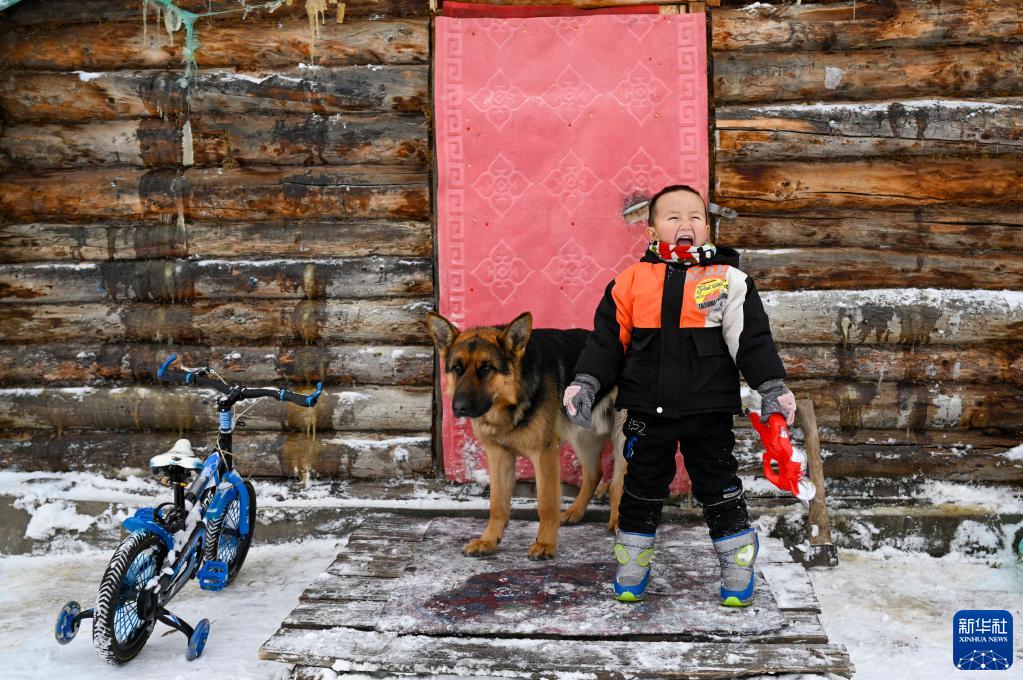 新疆阿勒泰地区禾木村的小朋友其力格尔在小木屋前玩耍(2023年1月11日摄)。新华社记者 胡虎虎 摄
