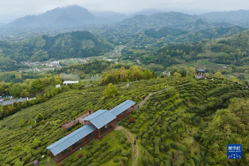 陕西省汉中市南郑区牟家坝镇一处茶园景色(4月5日摄,无人机照片)。