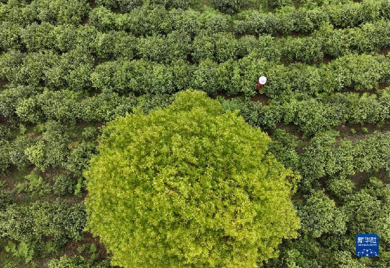 4月5日,茶农在陕西省汉中市南郑区牟家坝镇一处茶园内采摘茶叶(无人机照片)。