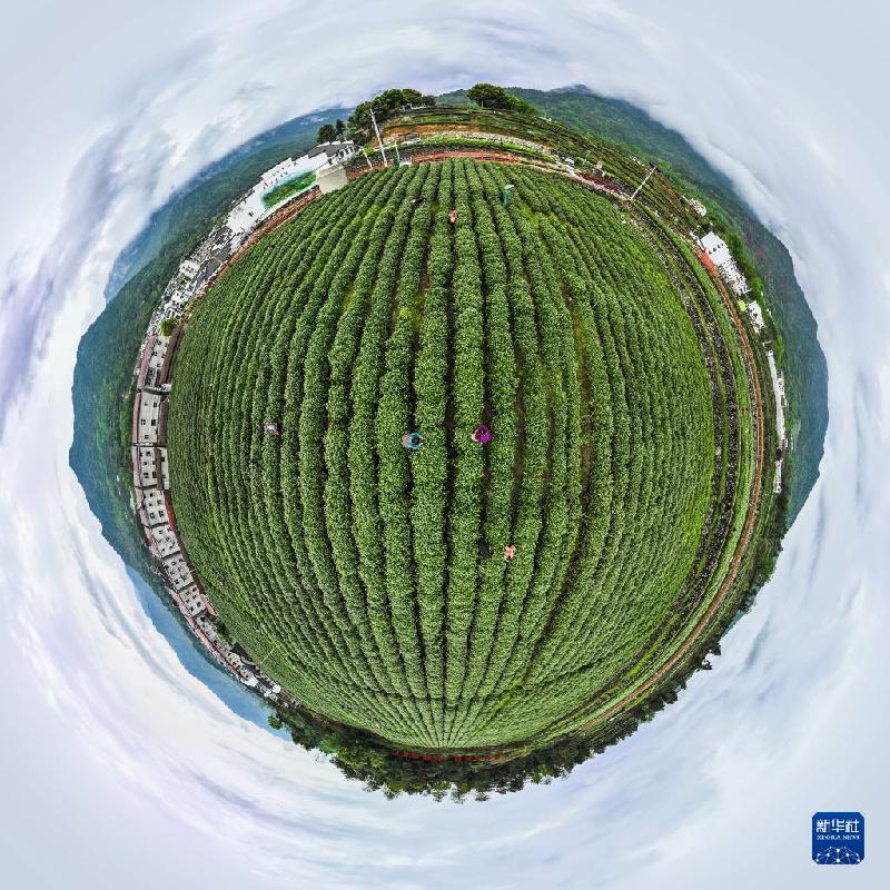 4月5日,茶农在湖北省宜昌市秭归县茅坪镇建东村茶园采茶(无人机全景照片)。