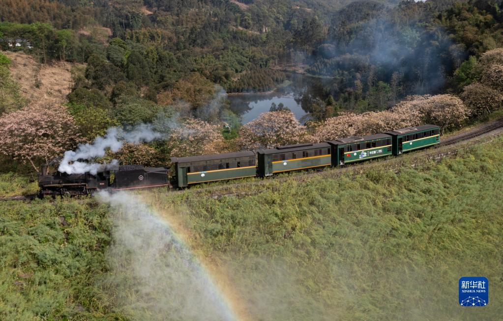 4月9日,一列嘉阳小火车经过亮水沱站的桐子花丛,喷出的蒸汽形成一道彩虹(无人机照片)。