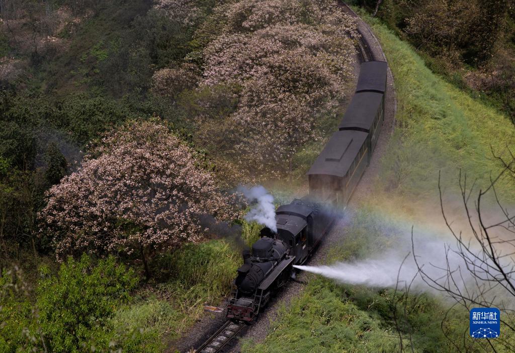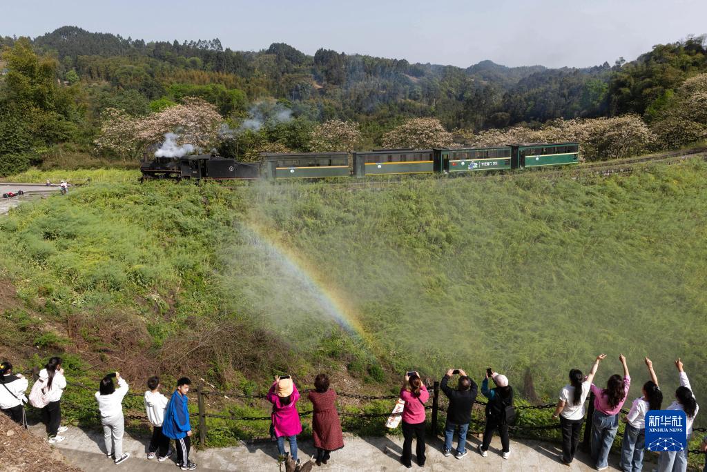 4月9日,一列嘉阳小火车经过亮水沱站的桐子花丛,喷出的蒸汽形成一道彩虹。