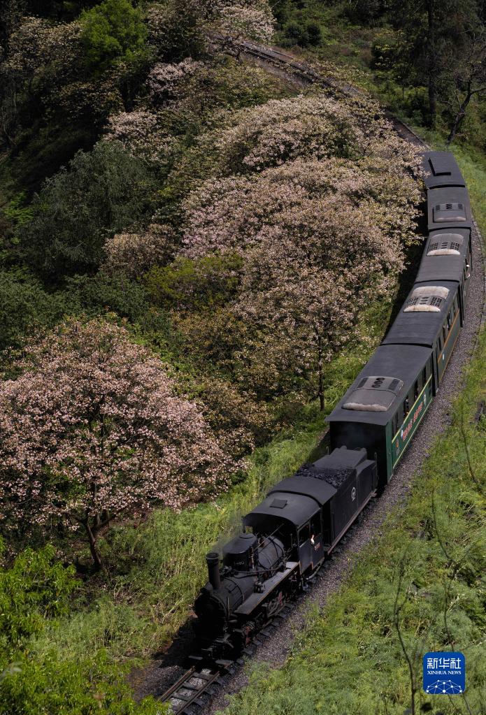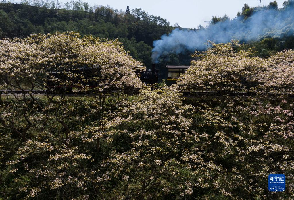 4月9日,一列嘉阳小火车经过亮水沱站的桐子花丛(无人机照片)。