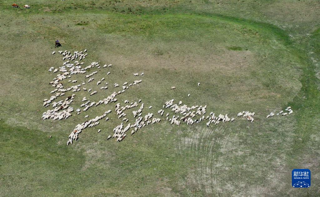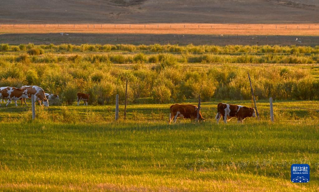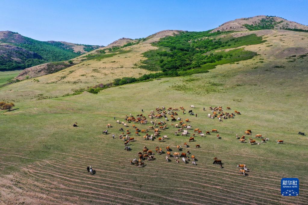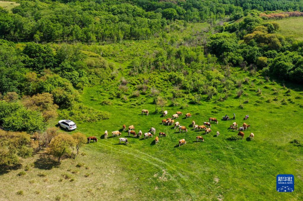 夏日,内蒙古阿鲁科尔沁草原绿意盎然,牛羊在草原上觅食,景色如画。
