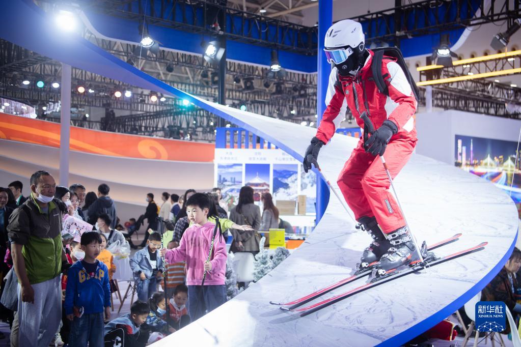 4月22日,观众在第二届中国(武汉)文化旅游博览会的辽宁馆内体验冰雪运动装备。