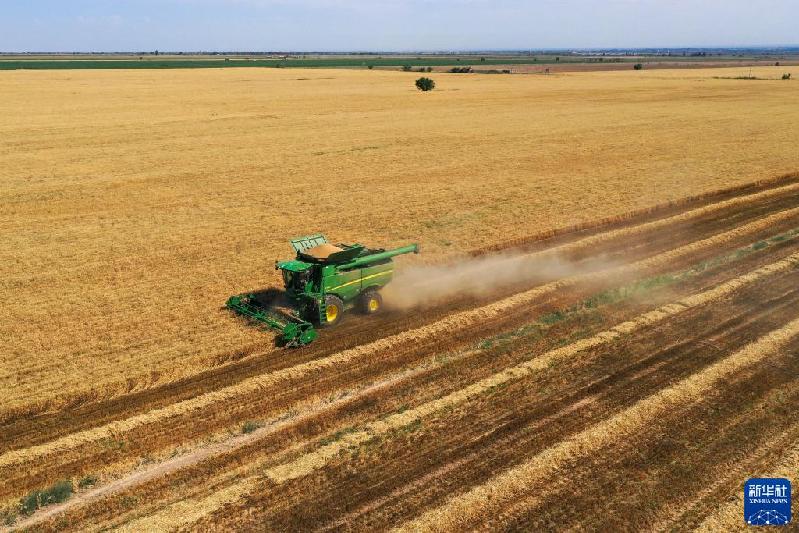 农机手驾驶联合收割机在新疆呼图壁县二十里店镇宁州户村收割小麦(7月15日摄,无人机照片)。