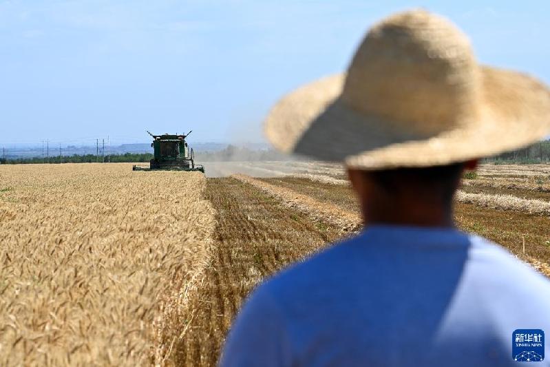 农机手驾驶联合收割机在新疆呼图壁县五工台镇小泉村收割小麦(7月15日摄)。