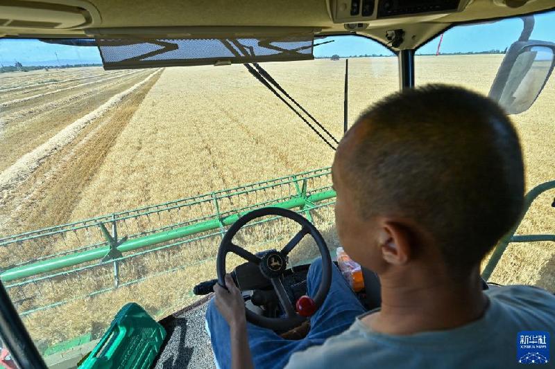 农机手驾驶联合收割机在新疆呼图壁县二十里店镇宁州户村收割小麦(7月15日摄)。