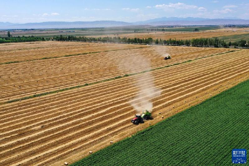 农机手驾驶机械在新疆呼图壁县二十里店镇宁州户村田间打捆小麦秸秆(7月15日摄,无人机照片)。