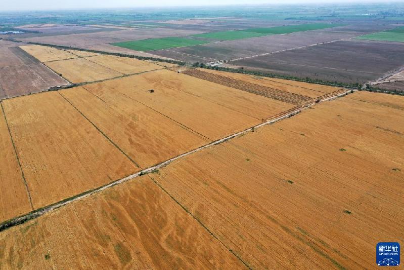 这是7月15日在新疆呼图壁县二十里店镇宁州户村拍摄的麦田(无人机照片)。