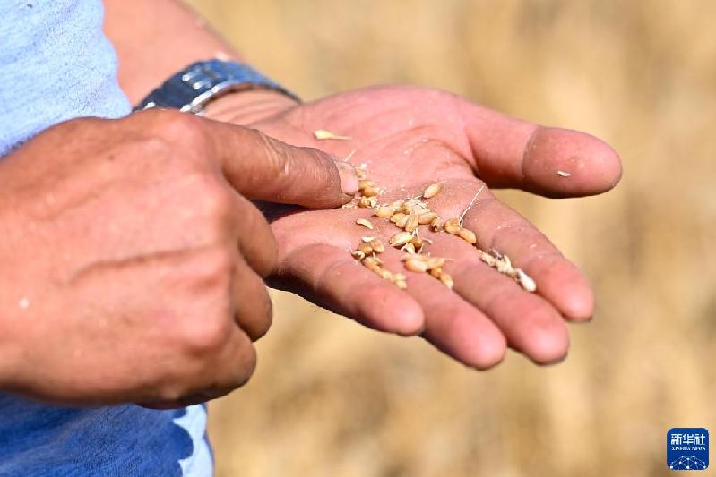 新疆呼图壁县五工台镇小泉村的粮农查看收获的小麦(7月15日摄)。
