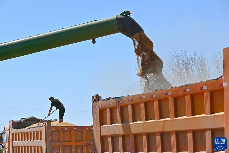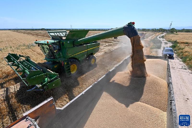 农机手操作联合收割机在新疆呼图壁县二十里店镇宁州户村将小麦装车(7月15日摄)。