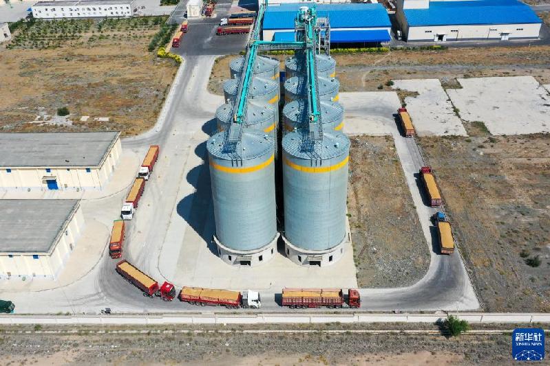 运粮车在新疆呼图壁县一家粮食收购企业外排队等待卸粮(7月15日摄,无人机照片)。