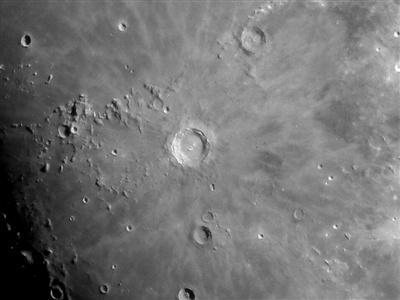 哥白尼环形山。采用改装GoPro4接英田80APO天文望远镜拍摄。摘除运动相机超广角镜头,加接圈与小型天文望远镜相连,可使拍摄倍率增加数十倍。