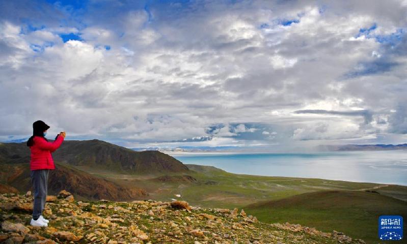 游客在扎日南木错湖畔拍摄(8月19日摄)。